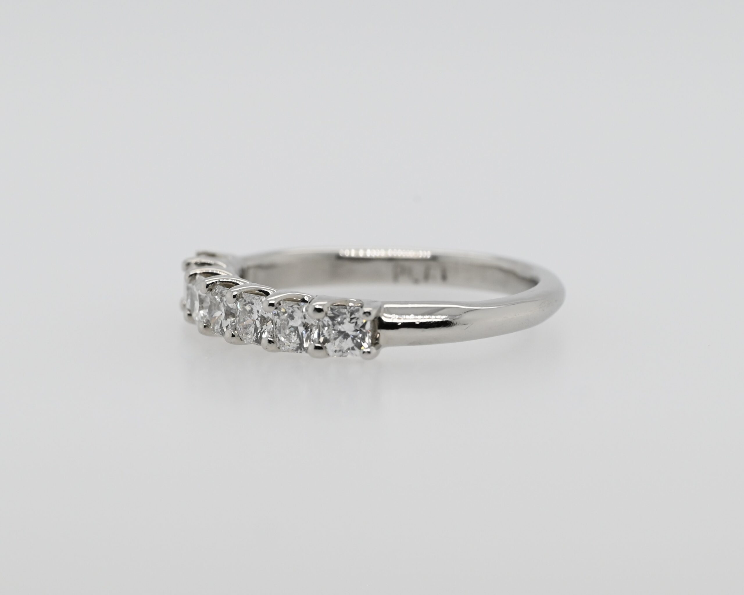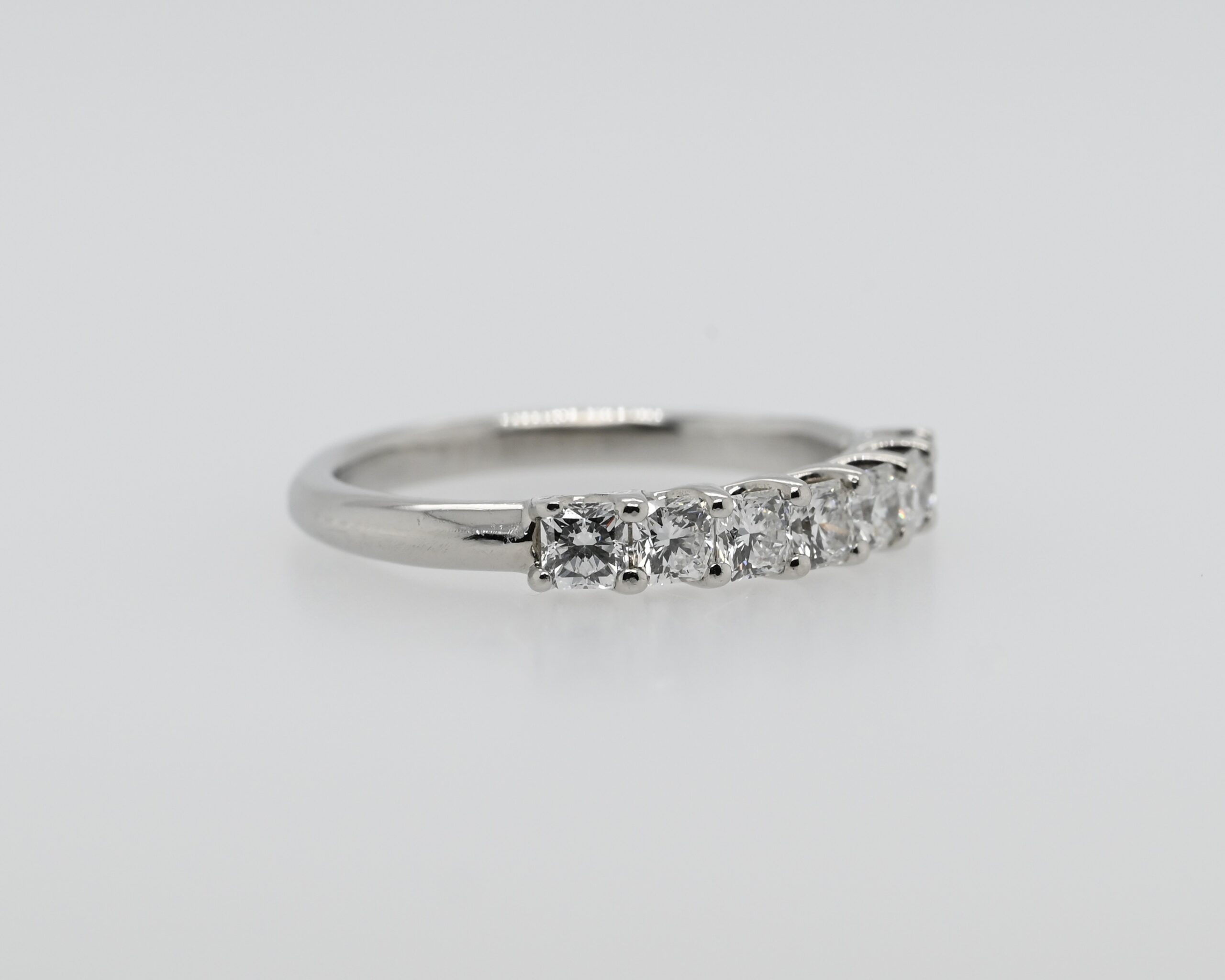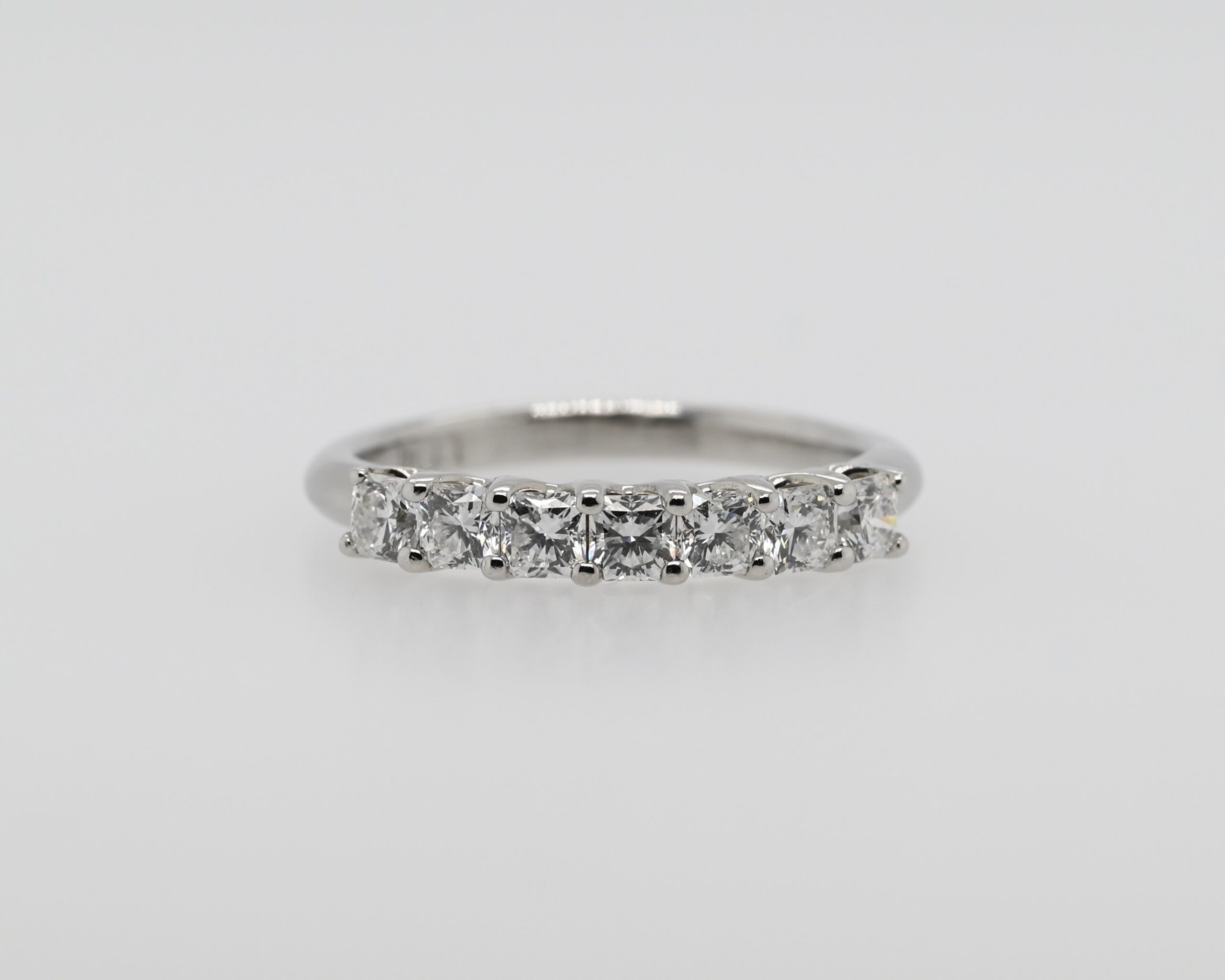 This exquisite Platinum Anniversary Ring features Seven Asscher Cut Diamonds, totalling 0.75 Carat TDW. The diamonds are of VVS-VS Clarity, F Colour, and Excellent Cuts, offering exceptional brilliance and sparkle.