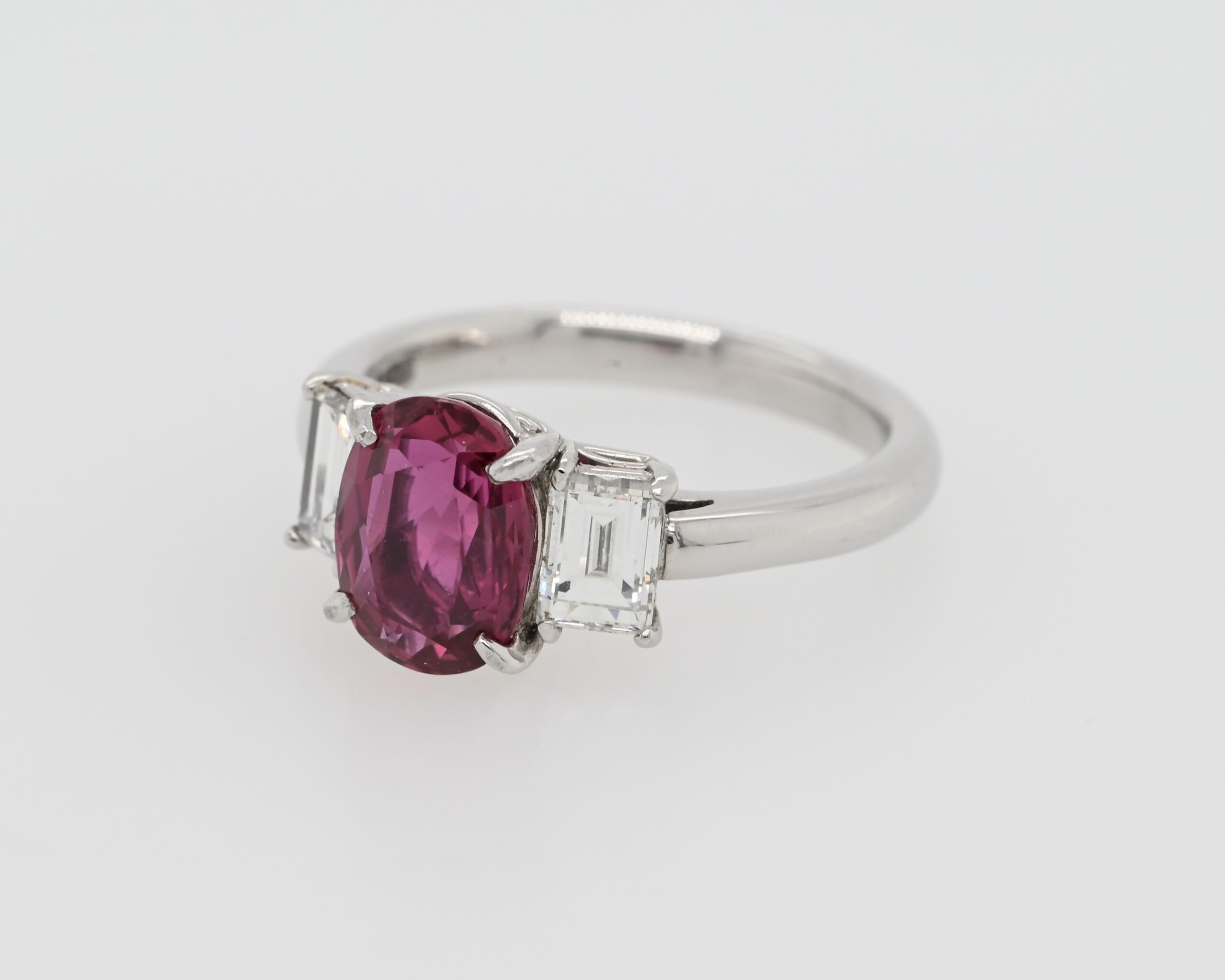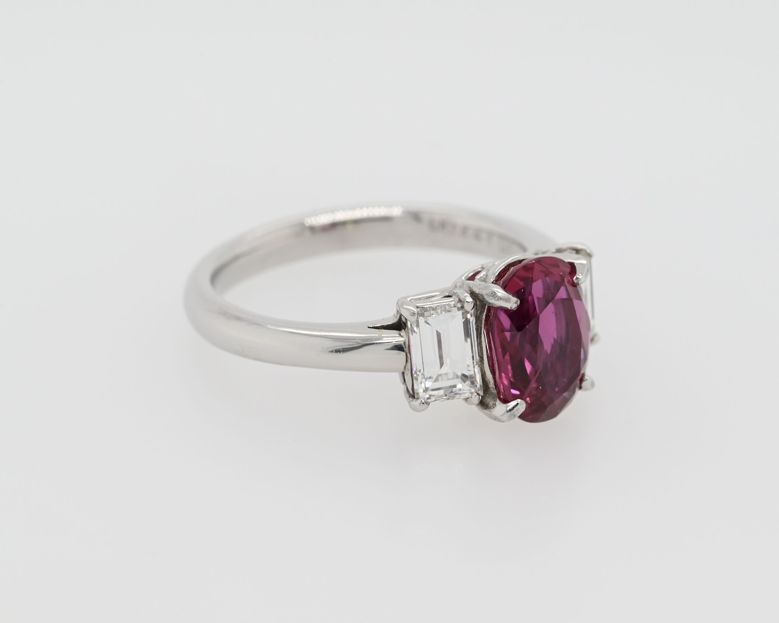 This stunning Platinum Dinner Ring features a striking 2.42 Carat Oval-Shaped Thai Ruby with a rich intense purple-red colour, certified by GIA (Report #2205044038). The ruby is eye clean with slight inclusions, showcasing its natural beauty and rarity.