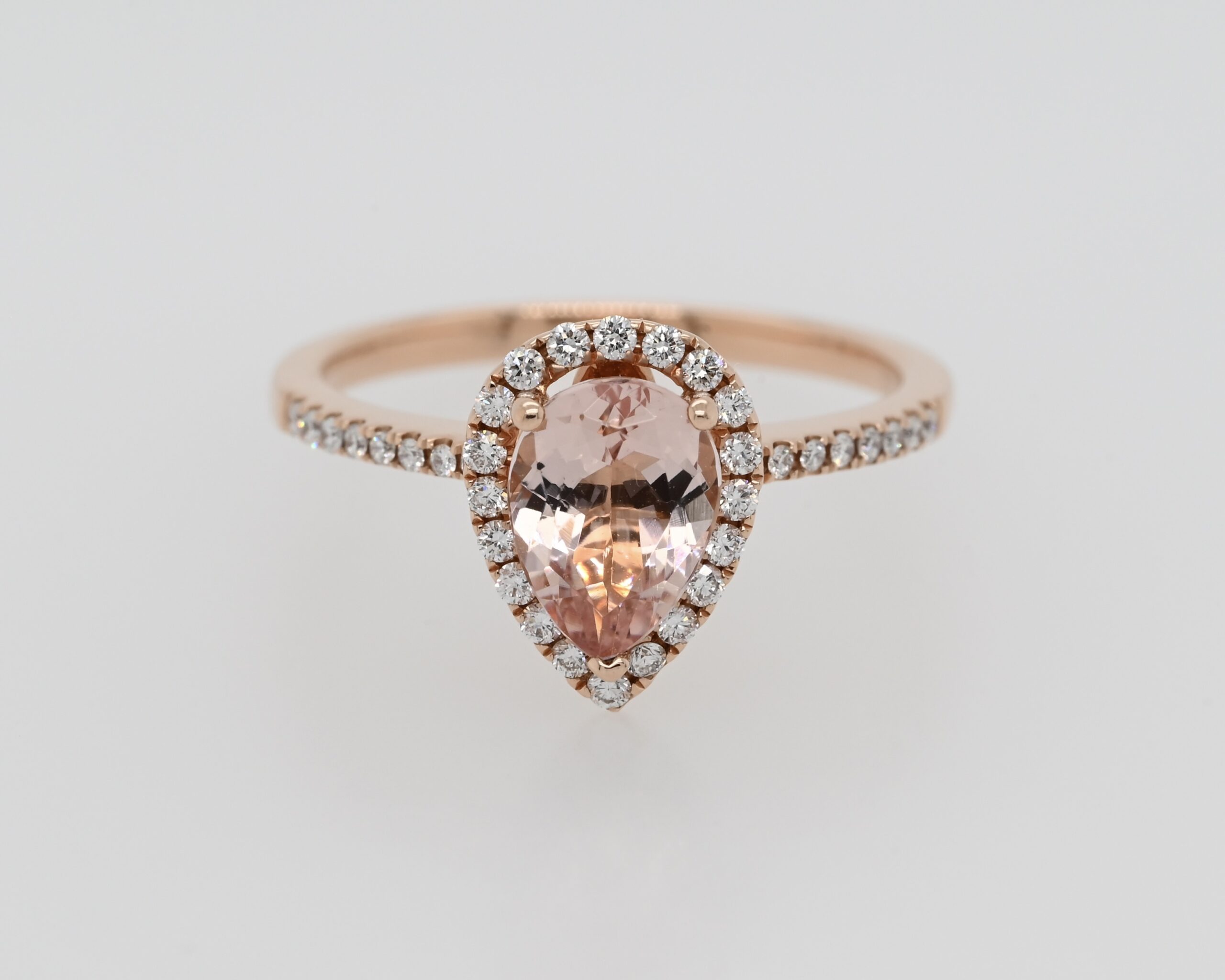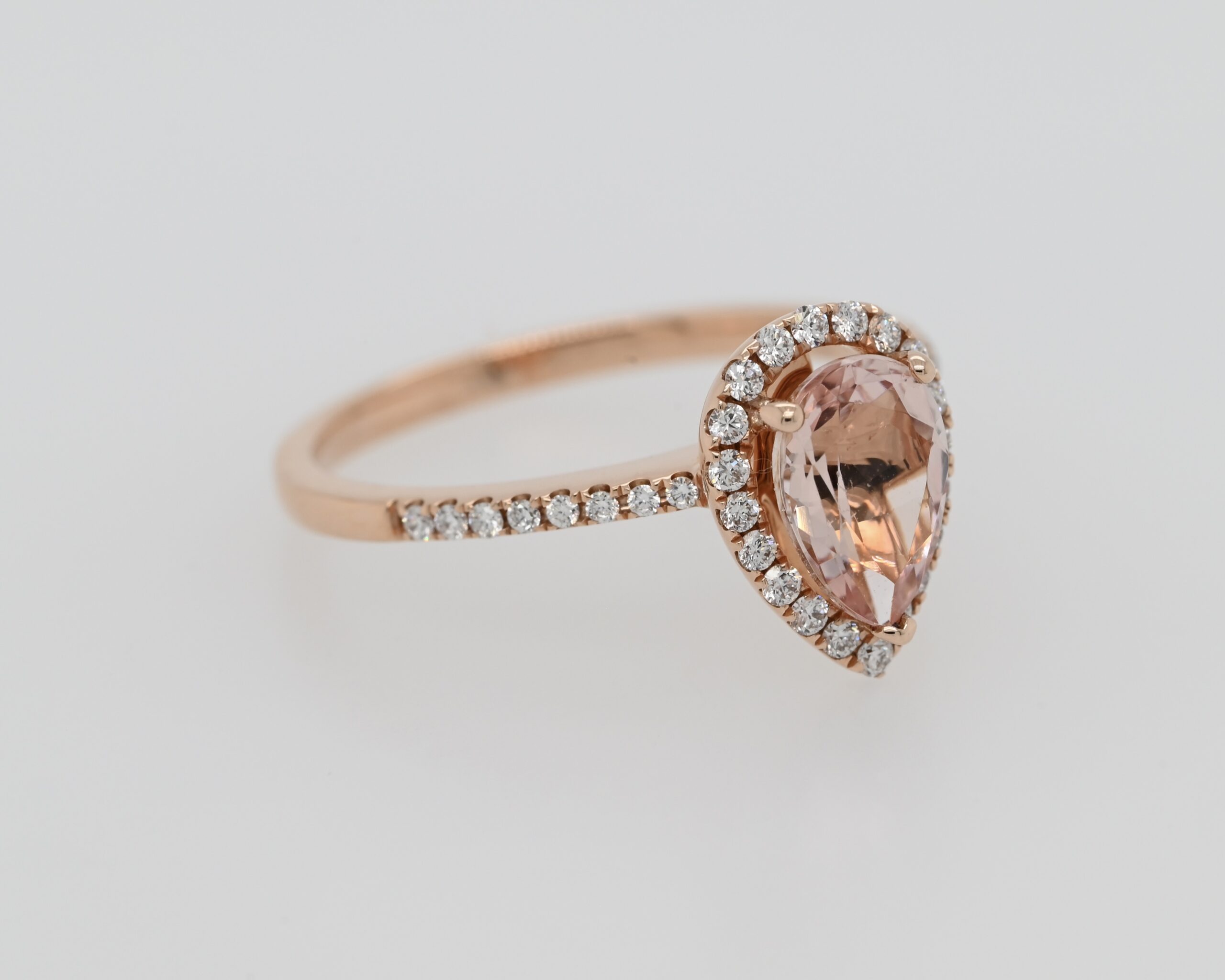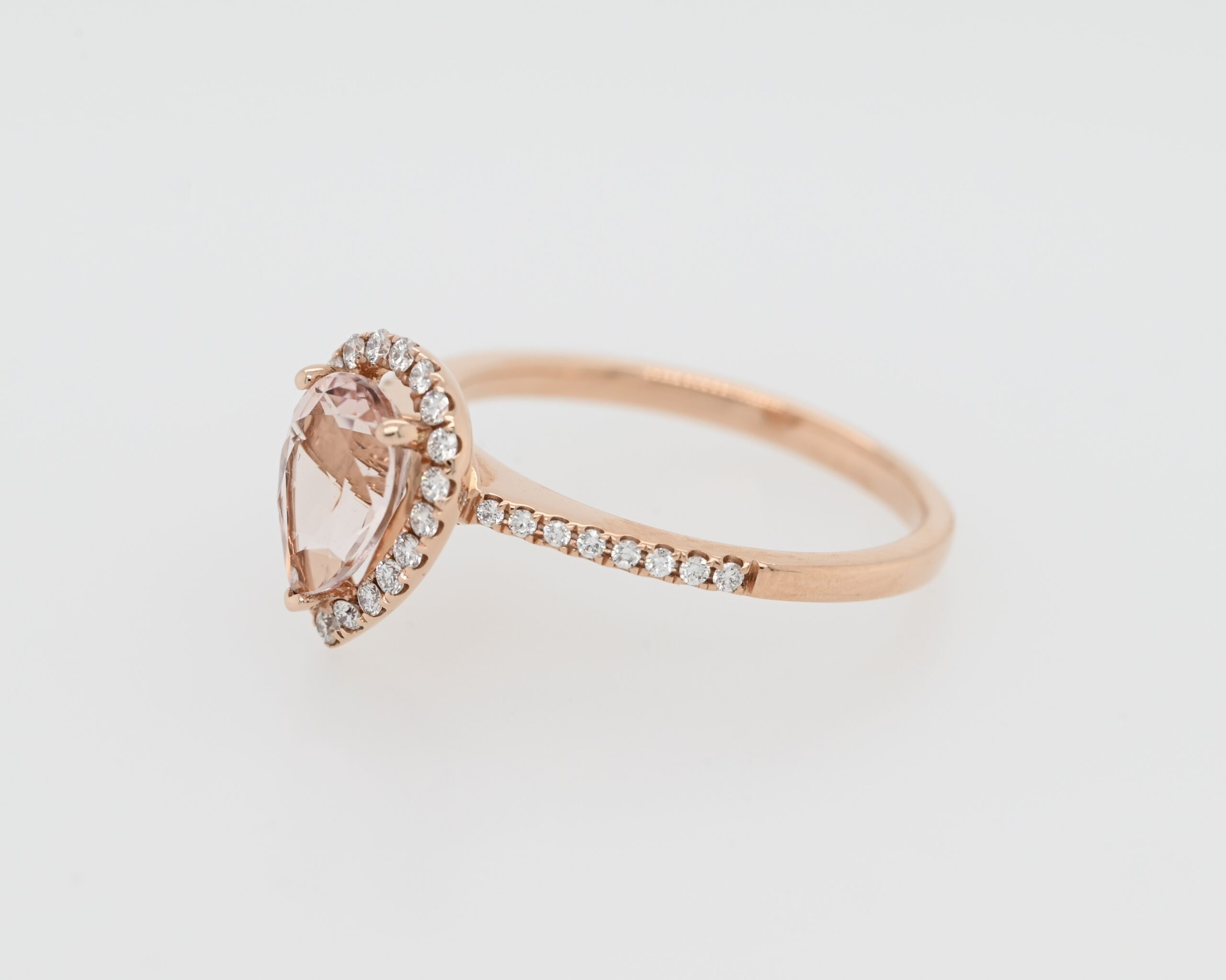 The warm tones of 14K Rose Gold perfectly enhance the beauty of the Morganite and diamonds, creating a sophisticated and feminine design that is perfect for any occasion.