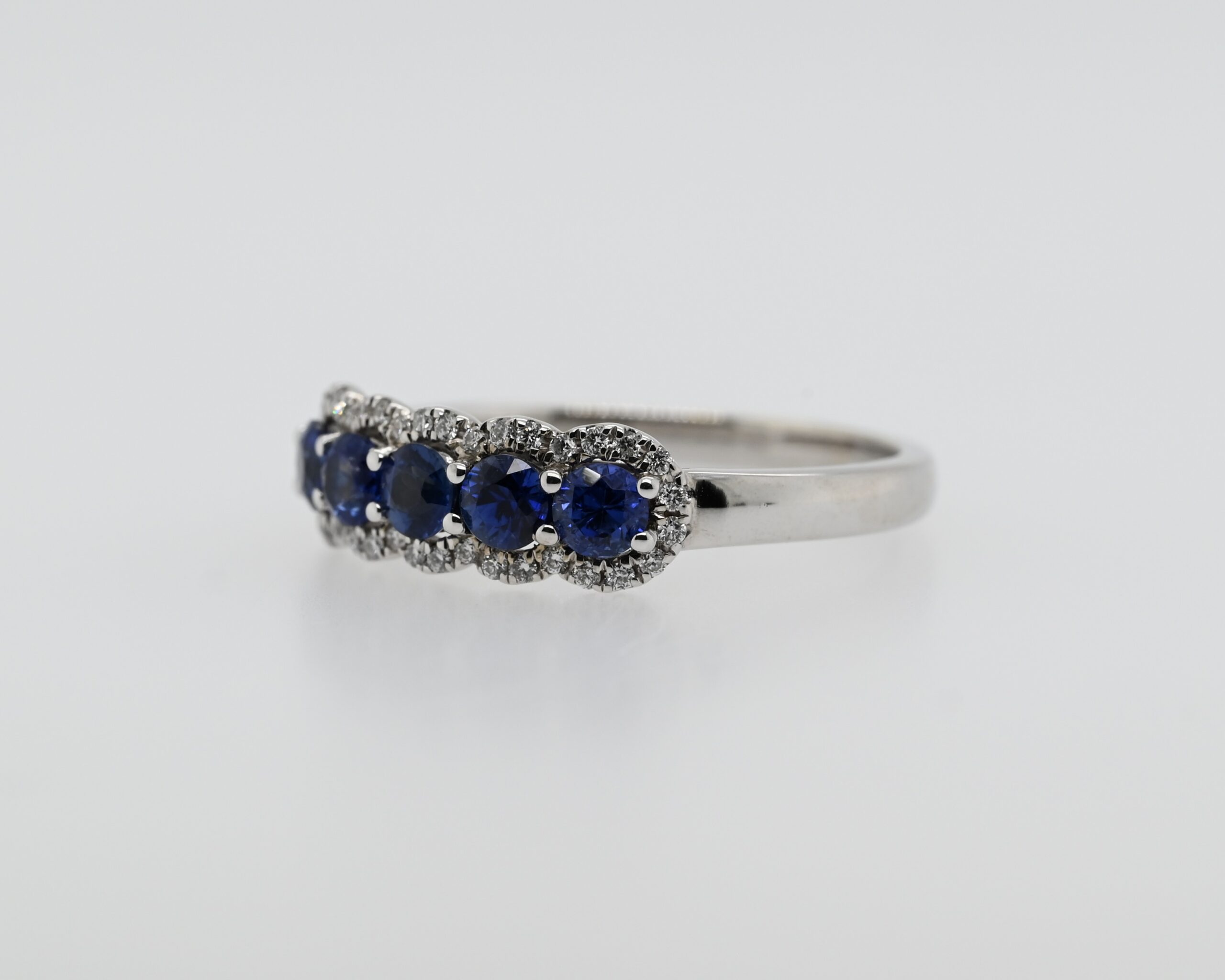 This elegant 18K White Gold Ceylon Sapphire and Diamond Ring features Five Round Ceylon Sapphires with a total weight of 0.77 Carat, known for their exceptional blue hue and clarity. The sapphires are beautifully complemented by 0.13 Carat Total Weight Diamonds, adding a touch of sparkle and refinement to the design.