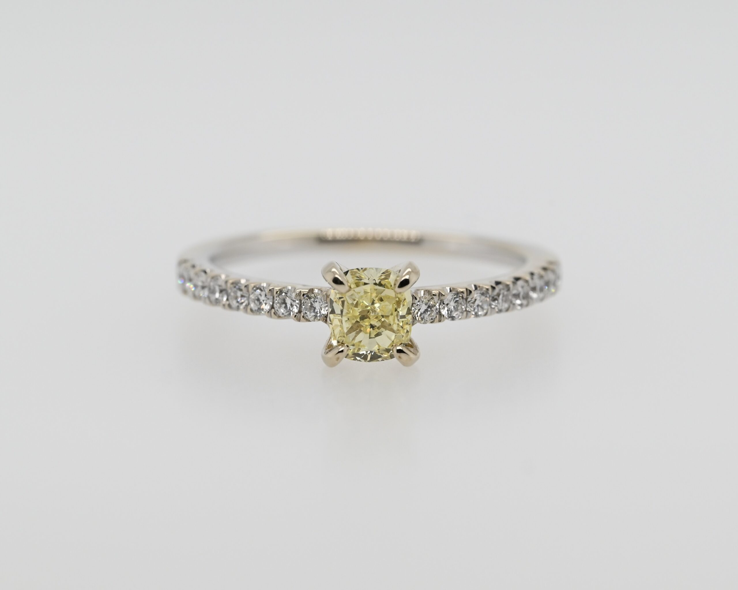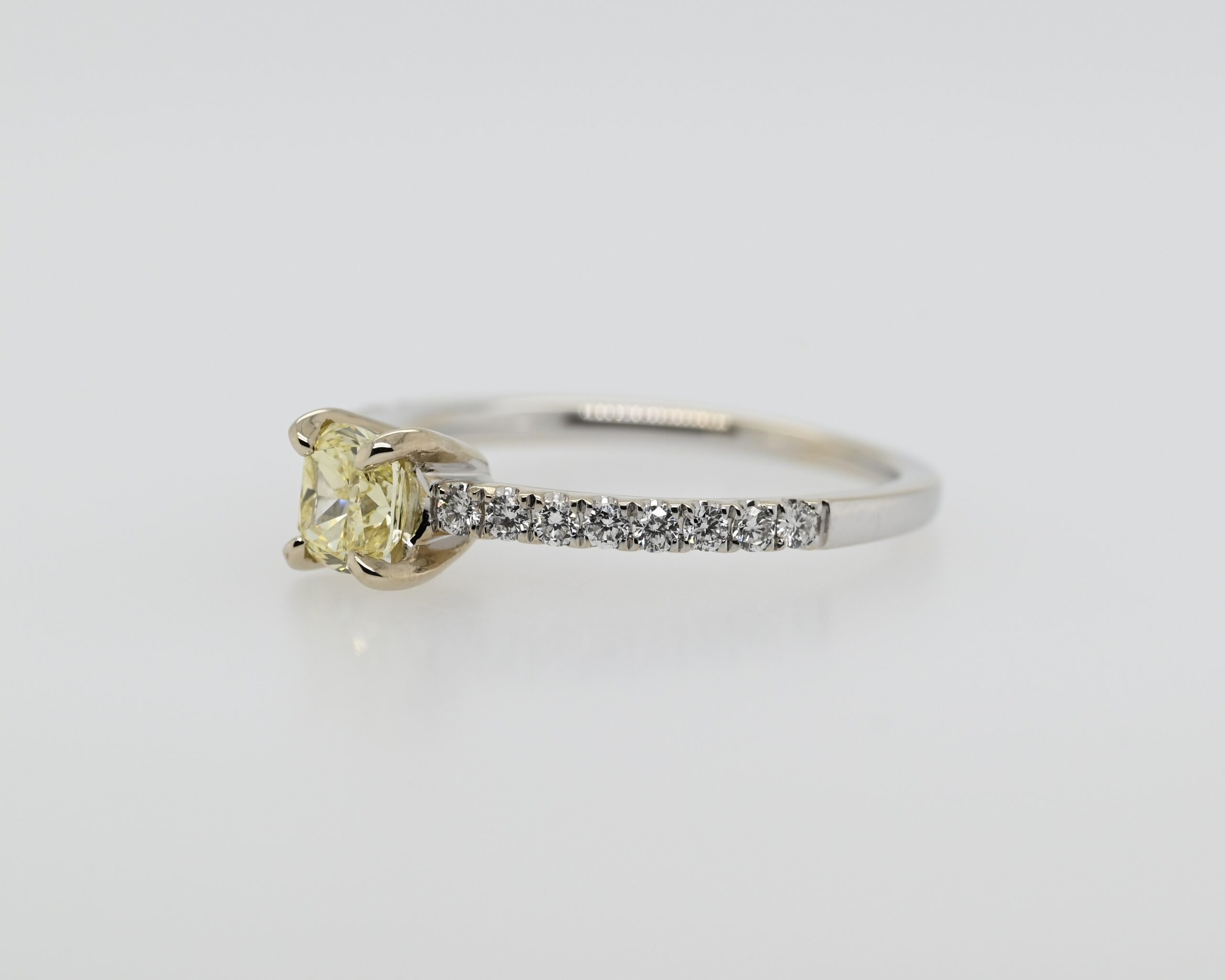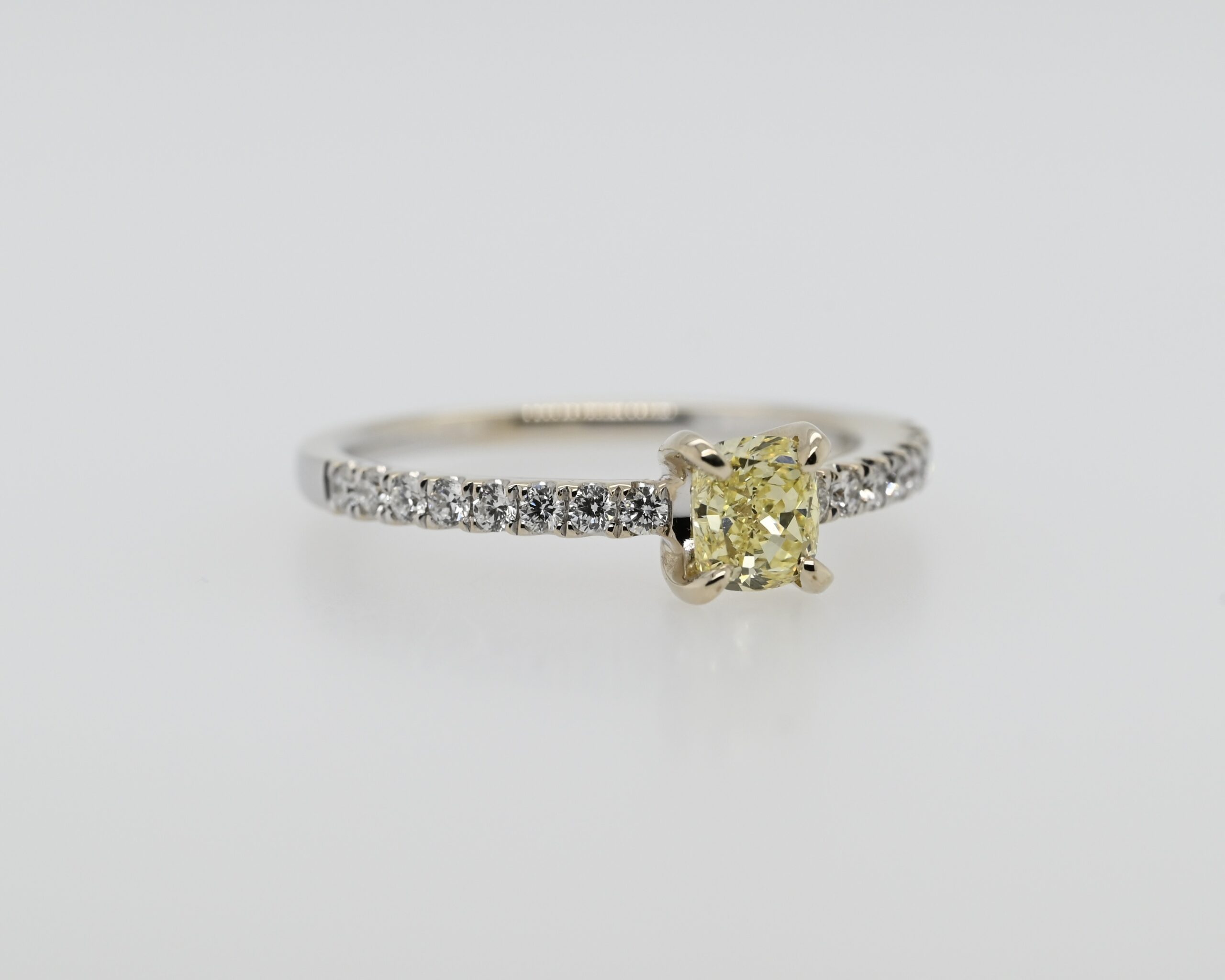 This stunning 18K White Gold Engagement Ring features a 0.50 Carat Cushion Cut Fancy Yellow Diamond, known for its vibrant, radiant colour and exceptional clarity. The diamond is Internally Flawless and comes with a GIA Report #10159680 confirming its quality.