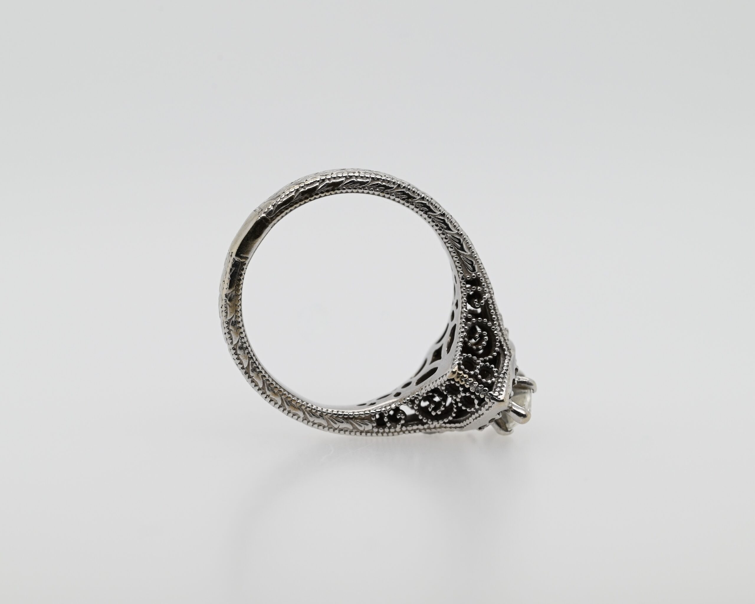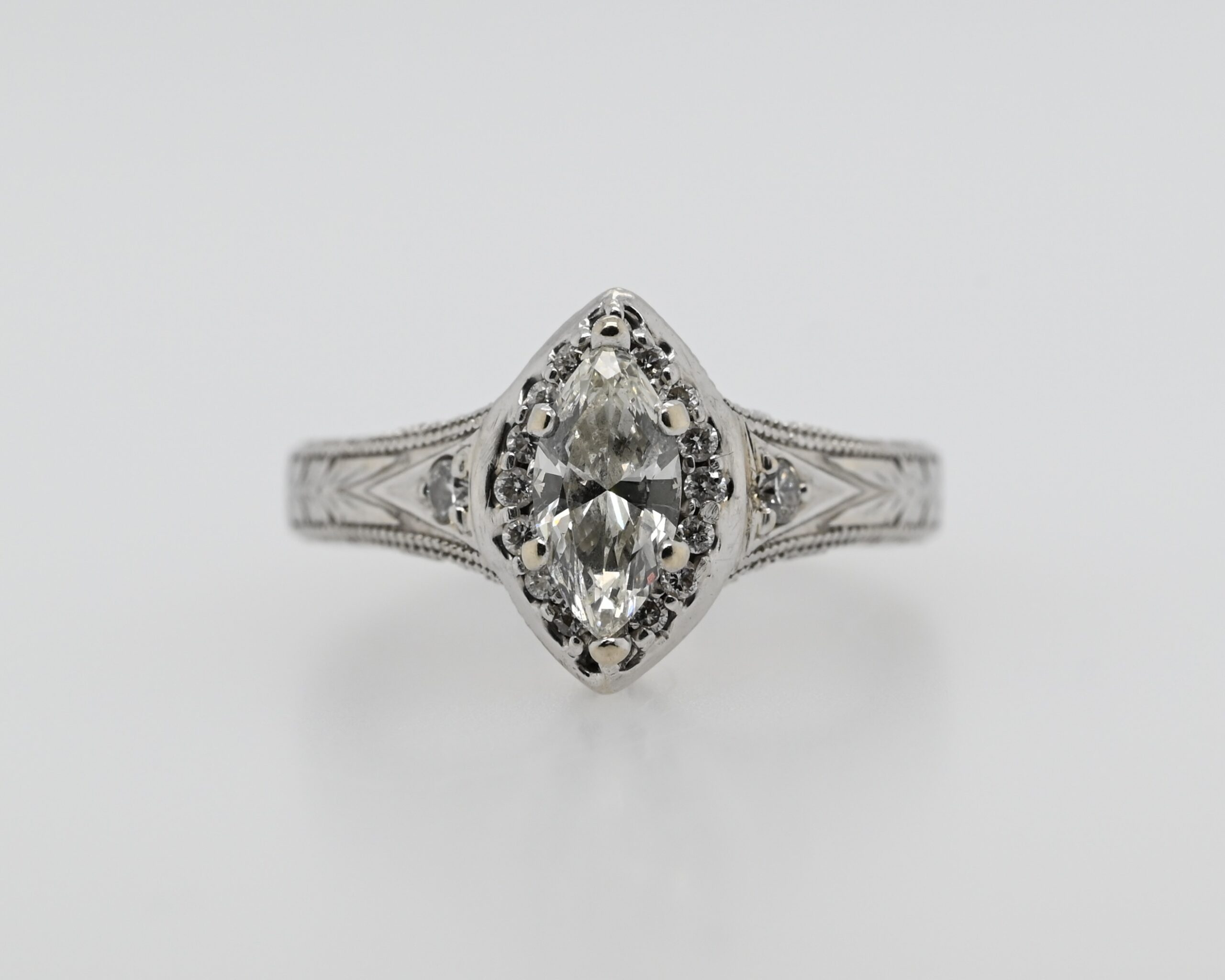 This elegant 14K White Gold Antique Patterned Engagement Ring features a stunning 0.50 Carat Marquise Cut Diamond, with VS-2 Clarity, I Colour, and Very Good ratings for Cut, Polish, and Symmetry as certified by GIA Report #5193200254. The diamond’s unique marquise shape is complemented by 0.18 Carat TDW Side Stones, adding extra sparkle and sophistication.