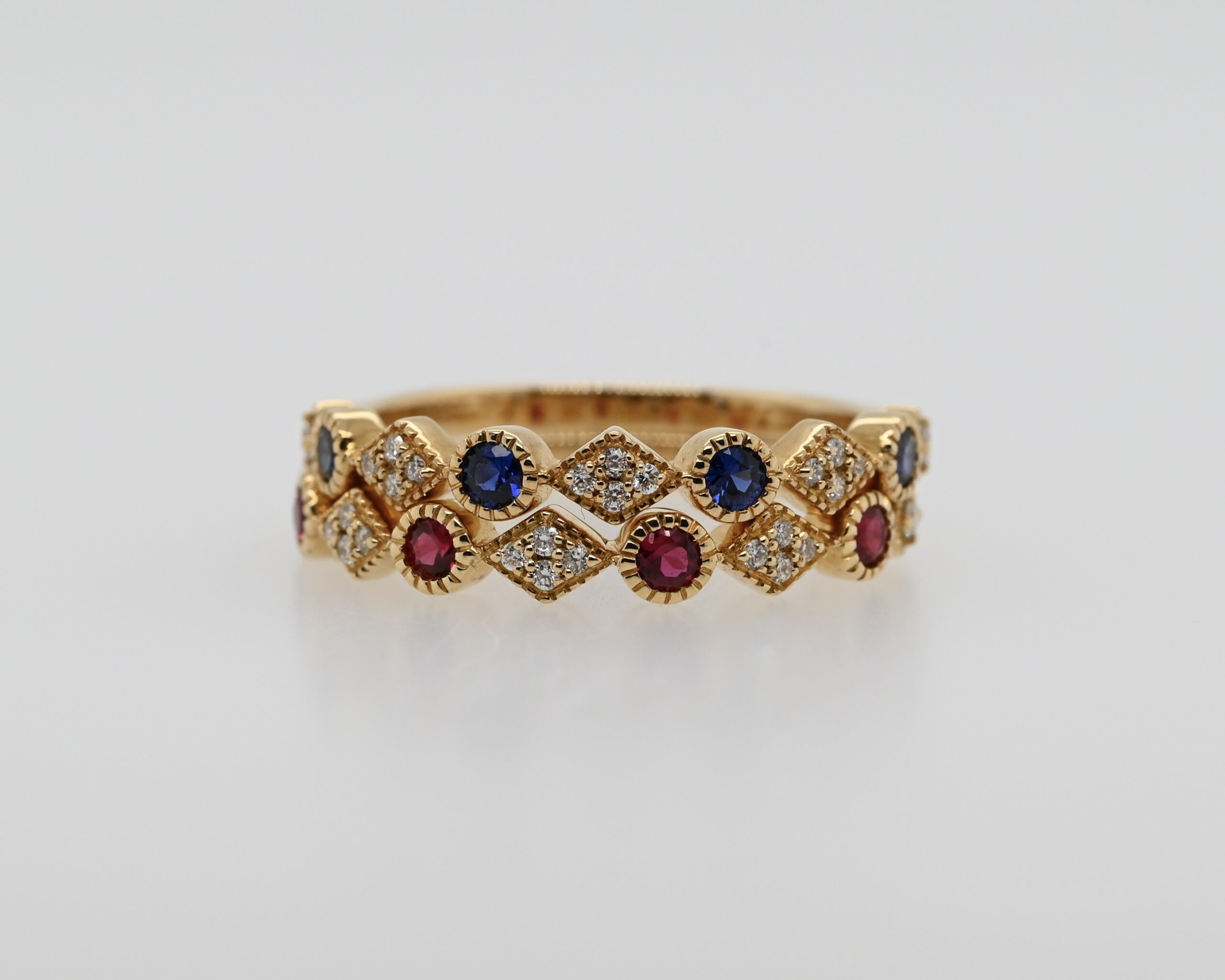 Perfect for stacking or wearing alone, this versatile ring combines the warmth of 18K Yellow Gold with the rich colour of rubies and the brilliance of diamonds, making it a timeless addition to any jewellery collection.